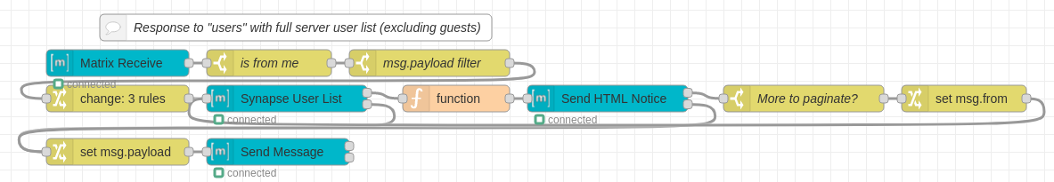 - Remove mention of Device ID being required for encryption (since it can now auto generate if not provided this could make people think they have to set it when that isn't the case) - matrix-js-sdk updated from ^v15.3.0 to ^v15.5.0 - got updated from ^11.8.2 to ^12.0.1 (this also required us to change how we import this library in code) - Node-RED version requirement added for >=v1.3.0 - NodeJS version requirement added for >=v14.0.0 - removed `process` dependency - send-image node fixed so error doesn't get thrown (`matrix-js-sdk` updated causing some errors) - updated send-image node docs to explain that msg.contentType is necessary for some clients to render the image (otherwise it could display as a blank message in the room). - If a matrix server configuration node was missing it's User ID it would throw a TypeError instead of telling the user the actual issue. - Updated user list example: it now paginates all users on the server (if you had a lot of users the message would fail to send because it was too large) - Added example for creating a room and inviting a user - Added example for joining a mentioned room - Added example for listing out a user's or server's rooms - Added example for getting session data from a user via whois info - Added example for getting a room's user list - Added example for downloading & storing received files/images - Added example for kicking/banning user from a room. - Added example for deactivating a user - Removed message in the room-users config stating it only works if you are an admin - Receive node now outputs `msg.filename` for files and images